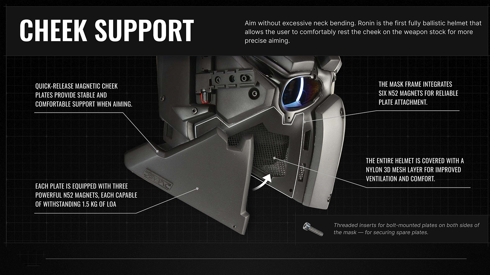Ronin is specifically optimized for shooters. Its magnetic quick-release cheek plates allow the operator to rest the cheek comfortably on the weapon stock without excessive neck bending — a rare advantage for fully ballistic face-protecting helmets.