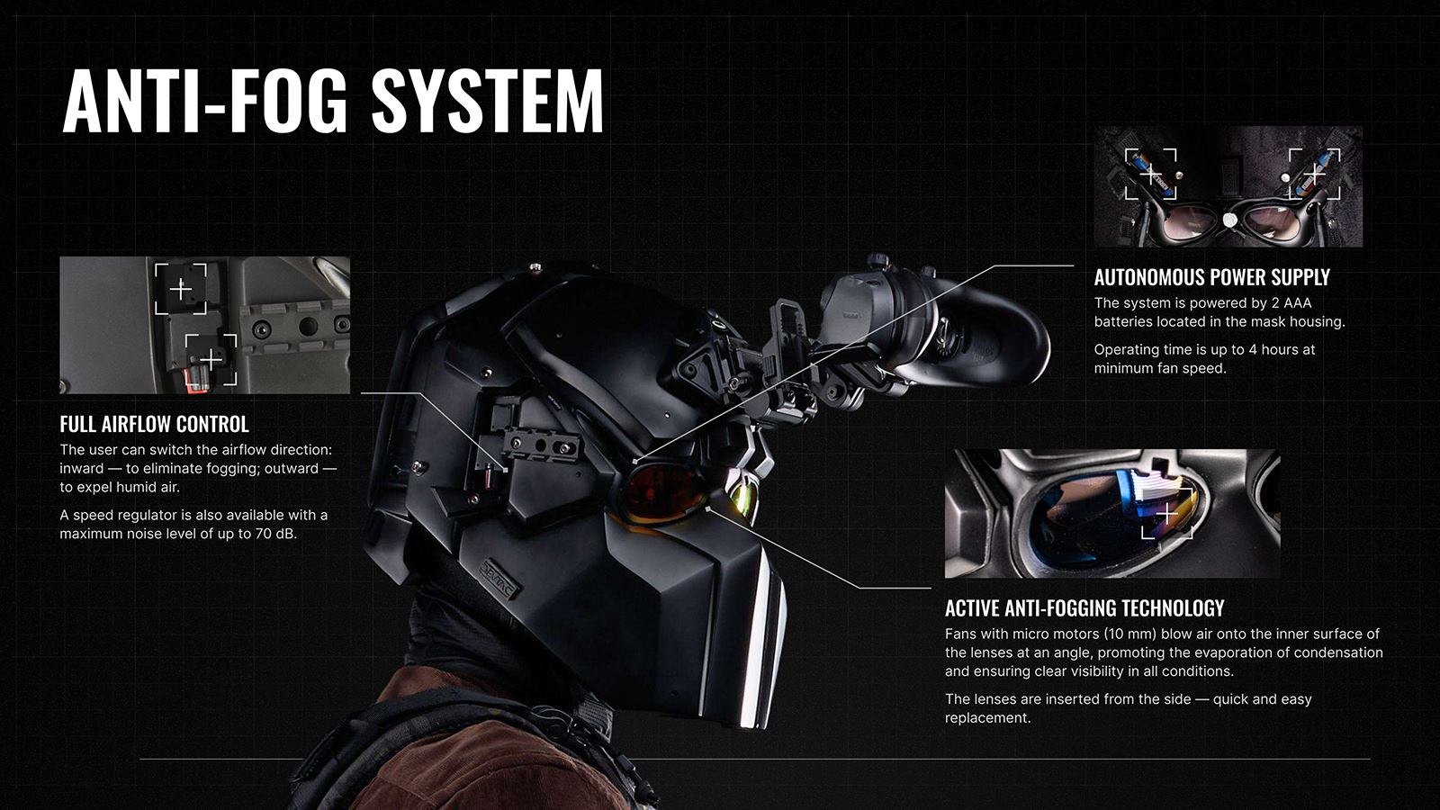 One of Ronin’s signature technologies is its active anti-fog system. Micro-fans integrated into the lens frame direct airflow along the inner lens surface, utilizing the Coandă effect to prevent condensation and ensure clear vision in all weather conditions. The operator can switch airflow direction, regulate speed, and operate the system autonomously for up to 4 hours using two AAA batteries.
