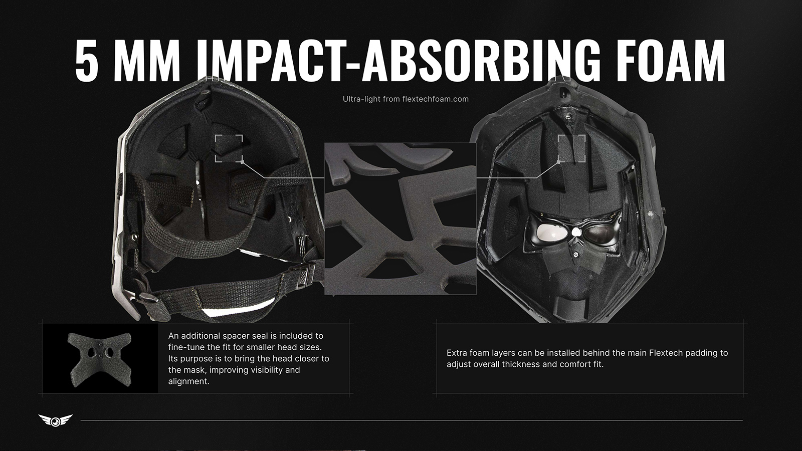 The helmet consists of two main sections — a front mask and a rear shell — providing up to 80% head coverage. Each 7 mm Kevlar plate includes an impact-absorbing rubber layer and can be replaced depending on ballistic rating, tactical configuration, or design requirements. The lightweight semi-flexible chassis acts as a universal platform for mounting a wide range of accessories, from Picatinny rails and communication units to NVG systems and HUD modules.